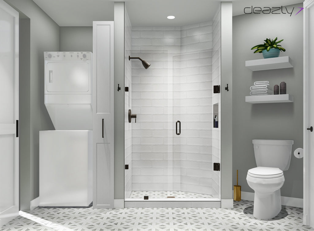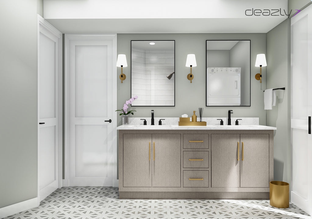 Neutral colors in the bathroom set a sophisticated tone that feels calm, inviting, and clean. Gray tones give this concept a bold look without using splashy colors. With its clean lines and bold proportions, the vanity brings a minimal aesthetic to the room. The wood grain ash veneer in a wirebrushed grey oak finish on the vanity is dressed to impress. Subtle geometric patterns in floor tiles add visual depth and balance to the space.