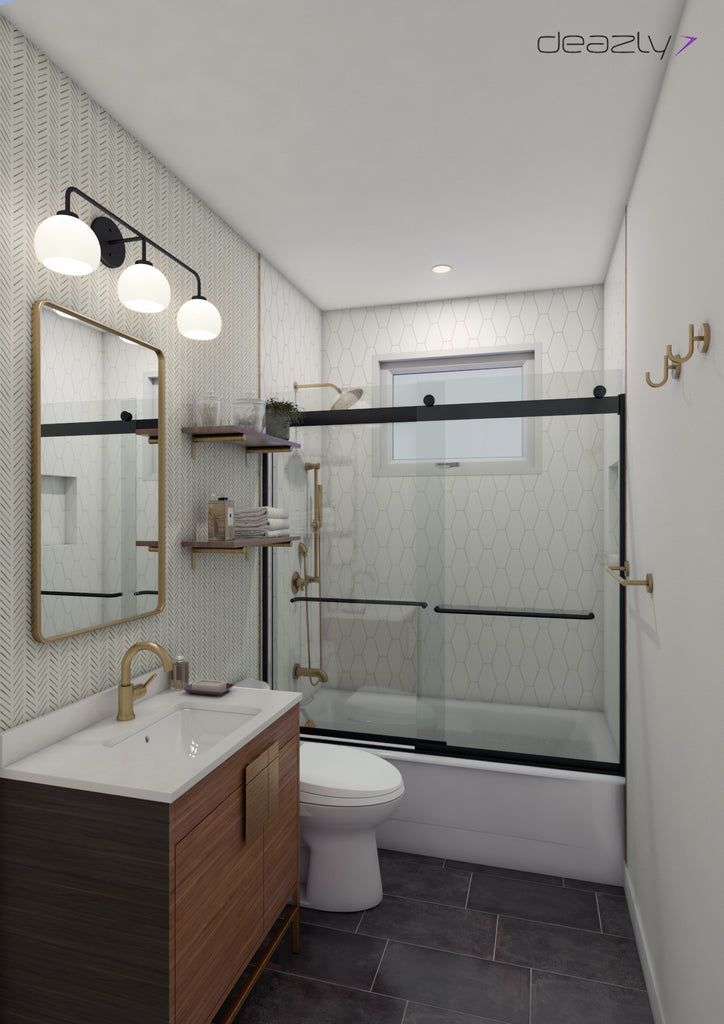 Taking a bolder approach, this bathroom design seeks to stun, yet provide a calming aura. Bold blacks are intentionally paired with warm woods and creamy whites to provide warmth in the space. Warm brass tones are brought in as accents to provide subtle luxe sensibilities, while nicely balancing out the black finishes. An accent wallcovering is provided at the vanity wall in a simplistic chevron pattern, providing a level of dimension and texture to add great eyecatching appeal for the homeowners and guests!