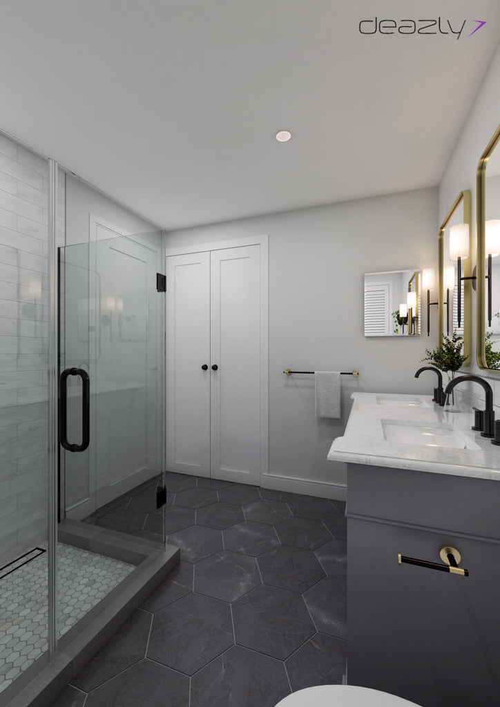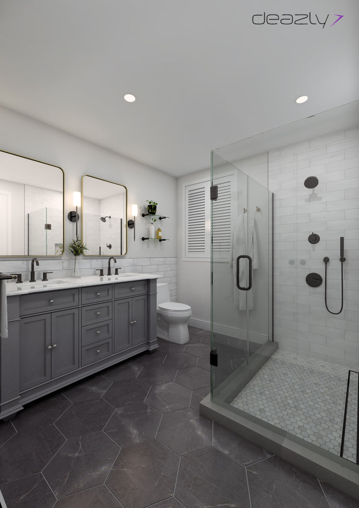 The option is meant to provide a bright and visually relaxing space to clean up and destress. Greys & whites dominate the palette and are complemented with black metal accents. The shelf right next to the window is perfect for potted plants that bring a touch of nature to the cool space.