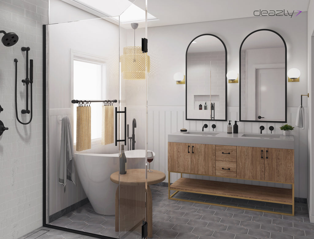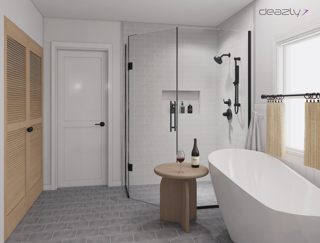 This modern redesign features a farmhouse style with fresh, simple materials, yet balanced with warm woods. The finishes were kept light but provide a variety of textures- subway tile within the shower, beadboard surrounding the tub and vanity, and a grey porcelain floor tile in a hexagon pattern. (instead of white wainscotting behind the vanity/ tub, there is an option to add color). The mixed metals provide a balance between the black matte finishes contrasted against the white finishes and the wood tones. The large soaking tub sits underneath the skylight. For evening baths, a decorative pendant above the tub will provide ambiance through soft lighting. A ticking stripe window covering provides privacy on the bottom portion of the window at the tub. Louvered doors were incorporated to both conceal and offer ventilation for the washer/ dryer.