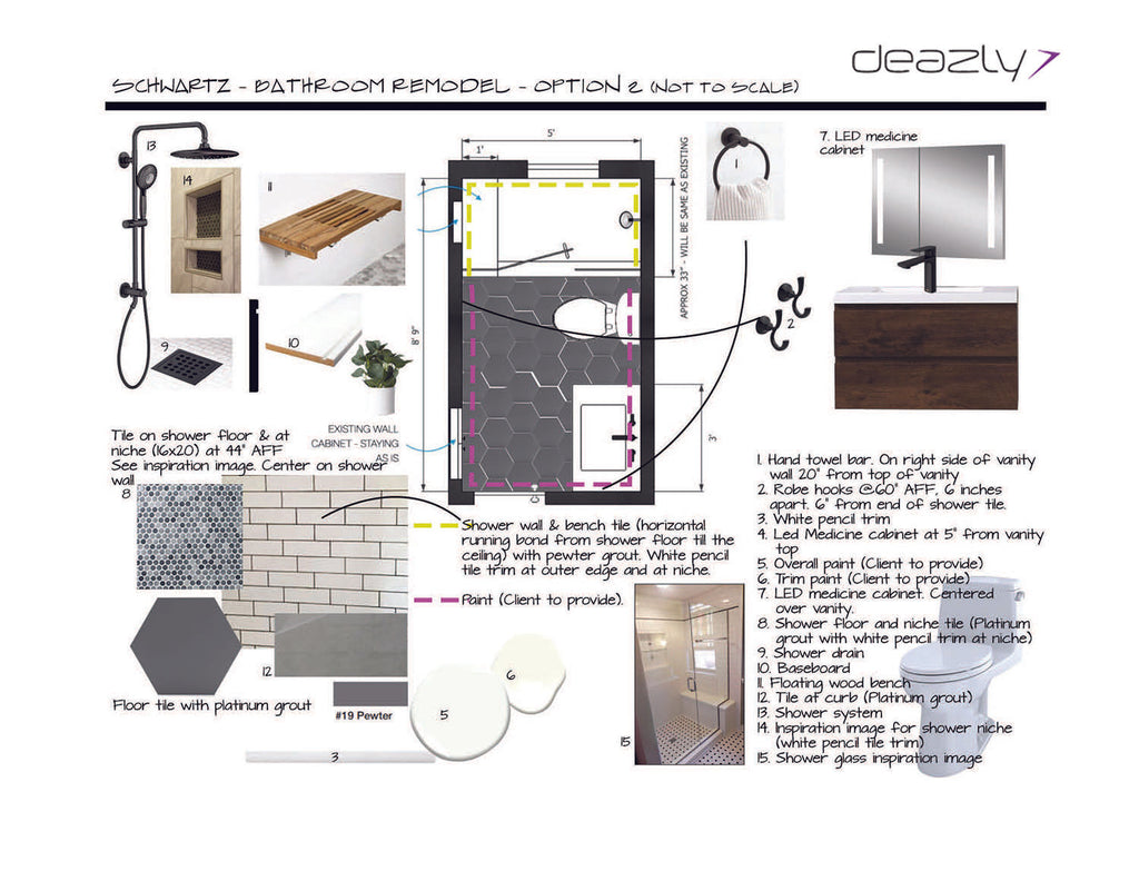 This cool bathroom features large gray hexagonal tiles and subway tiles in the shower wall. The vertical surfaces are dominated by white and framed with just enough black to bring a good visual structure. A medley of patterns and bold, monochrome colors paired with warm wood vanity and cool paint lend this room a playful yet refined feel.
