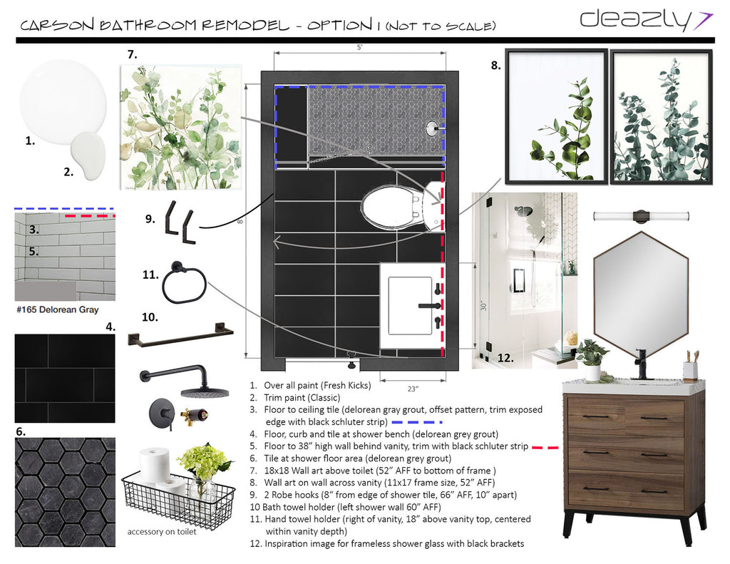 This room radiates a cool yet natural vibe owing to the stone-look flooring, warm wood vanity and botanical prints. This is interspersed with crisp lines seen in the hexagonal tiles, the fun light fixture and mirror. Matte black fixtures throughout the room provide a bold punch tying all the elements together in this functional and tasteful bathroom