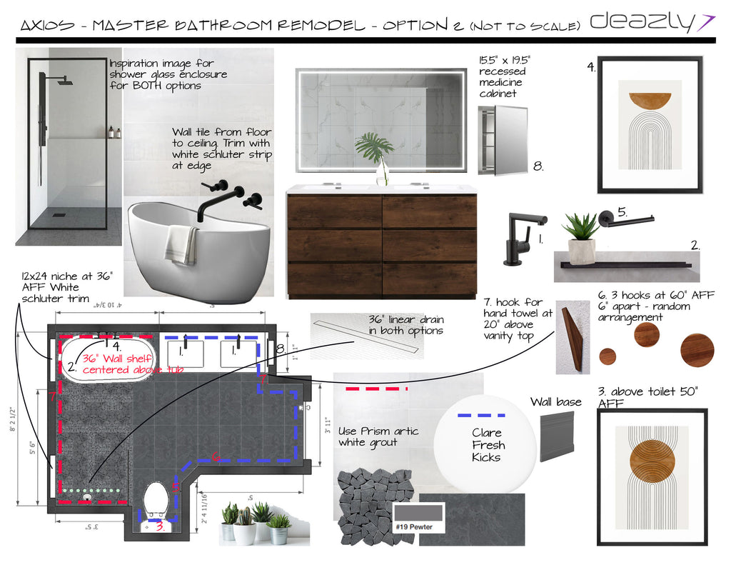 This option has light natural finishes throughout and is meant to offer a visually relaxing space to clean up and destress. It’s minimal and clean with each item serving a functional and stylish purpose. Warm tones are brought in by the spacious wood vanity and the sculptural robe hooks on the wall. The matte black finish on all the fixtures and accessories offers a contrasting bold punch to the cool space. The shower niche, recessed medicine cabinet, and shelf above the soaking tub all offer additional storage which is always needed.