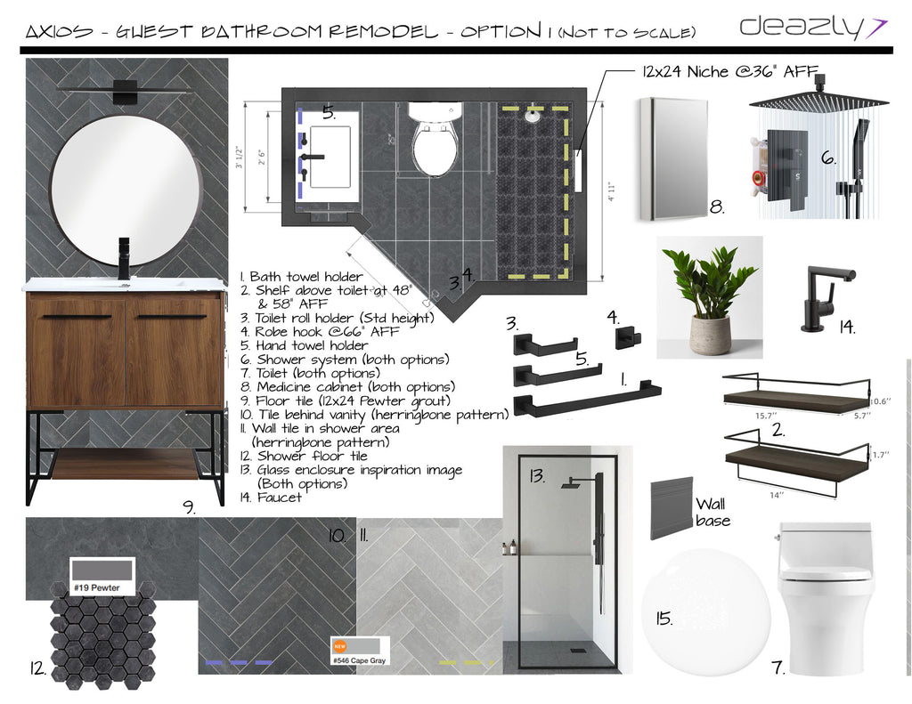 This bathroom features a modern display of materials and textures. The vanity wall tiled with the herringbone pattern provides a focal point in the room. Plenty of storage is offered within the spacious vanity, the functional circular mirror with a recessed cabinet behind, the second medicine cabinet (not shown in view), and the bold concrete shelves on the wall. The gray slate flooring complements the sleek design scheme. The warm wood tones in the vanity balance out the monochromatic tones in the rest of the space.