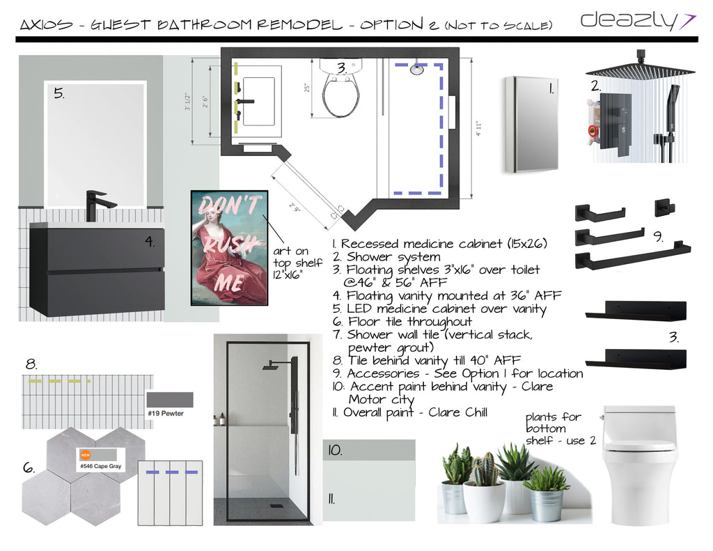 This clean, contemporary design boasts sharp lines and a predominantly white setting to convey a refined ambiance. The terrazzo tiles, which create a one-of-a-kind look with exposed stone aggregates, are durable and no-slip, making them ideal for a bathroom setting. Additionally, they create a playful contrast to the black bathroom fixtures and the orderly rectangular tiles that wrap around the shower enclosure and vanity wall. Metal shelving over the toilet along with the crisp wall-mounted vanity creates perfect storage opportunities. Furthermore, the led medicine cabinet with its easy functionality and futuristic edges coordinates with the overall modern atmosphere.