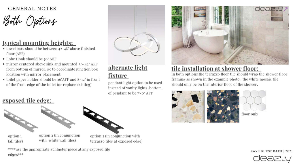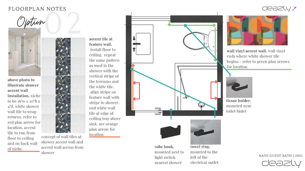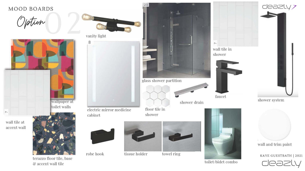 This design focuses on the introduction of bold colors, a modern composition of geometric shapes, and the graphic contradiction of black and white often seen in the midcentury modern interior. The dark terrazzo floor gives the space a deep visual ground while the white walls serve as an equally bright opposing force. One of the coolest features of this design is the way the ebony floor tile seamlessly turns up the feature wall and shower wall to visually tie the space together. The use of the modern vertical tile accents speaks to the lineal feel of the wallpaper pattern. This option offers an abundance of fun and bold but in a beautifully balanced way. Black fixtures and accessories are used to accent the terrazzo floor and provide a crisp contrast to the white walls and tile.