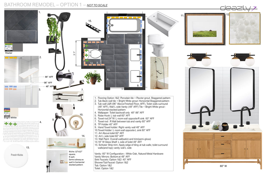 A fresh update balancing mid-century elements, rustic touches and black metals. The hero item vanity, radiates warmth in mid-tone white oak, and is offset with black notes throughout in the faucets, hardware and some accessories, and balanced against the walls, made bright and light with contrasting scale subway tile. The dark floor tile, though ceramic, reads slate, thereby grounding the space with a rustic touch and providing visual texture. MCM characteristics are reflect- ed in the organic and geometric lines, focus on functional accessories, and light hues with punches of color from artwork and plant life.