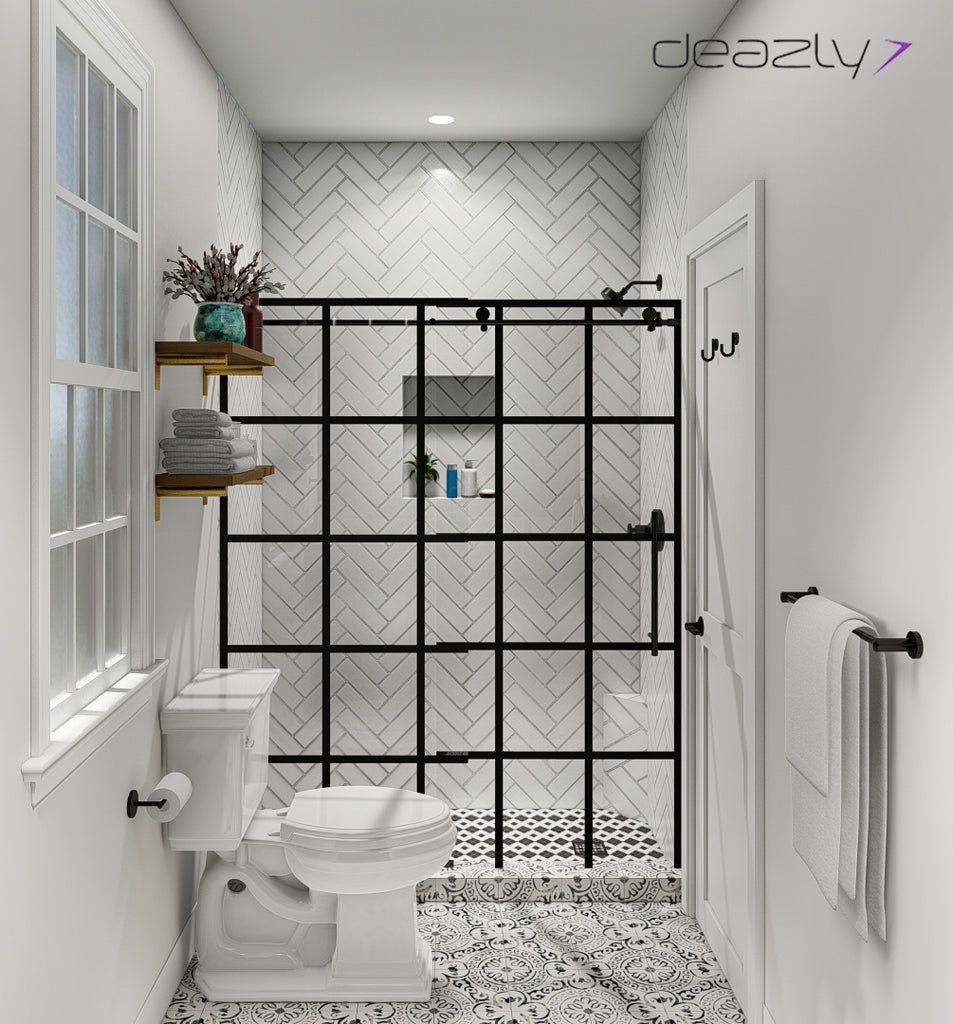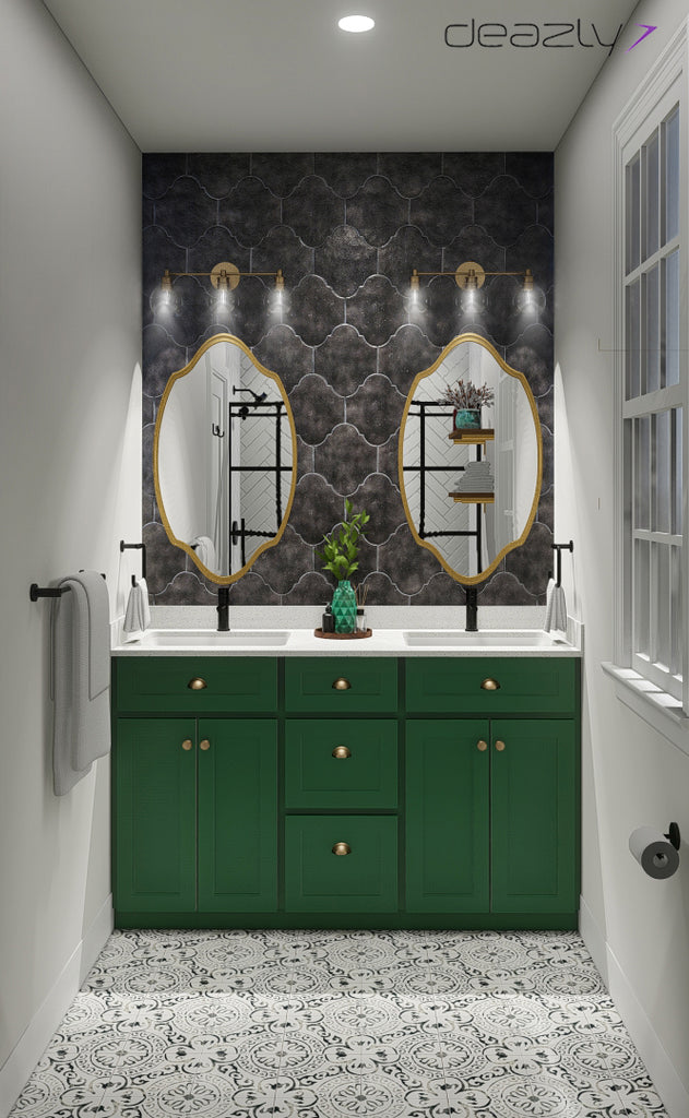 In this option, the sink wall becomes the focal point of the room, with a full height installation of a unique arabesque shaped wall tile in a black antique brick texture. The visual depth of this tile serves to highlight the “WOW” effect of a saturated shamrock green paint color on the vanity. We’ve finished the vista with gold accents on the hardware, mirrors and light fixtures which provides a feminine softness to contrast the masculinity of the industrial shower door system, fixtures and accessories. The scrolling medallion motif on the floor pays homage to shape of the vanity wall tile. The two together serve to visually balance the geometric herringbone pattern of the shower wall and grid pattern on the glass shower door. The black and white is a sophisticated combination that withstands the shelf life of trendy and offers a classic, timeless look.