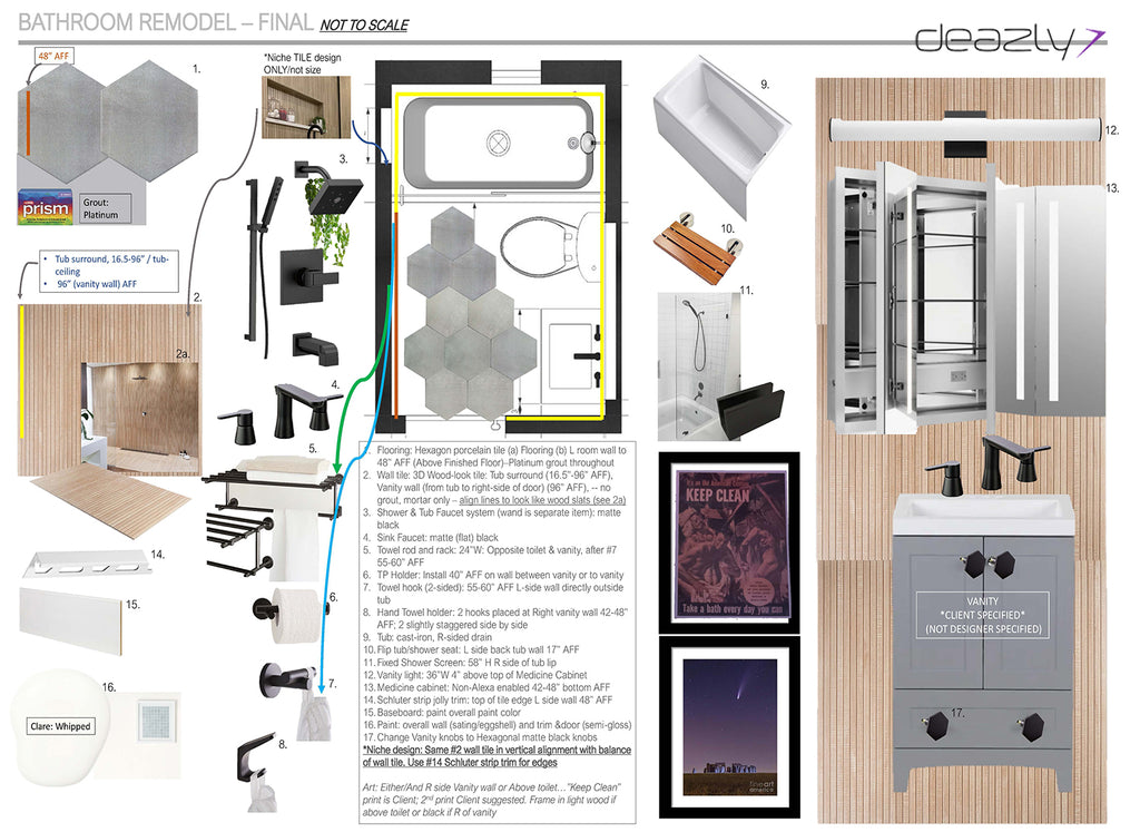 Warm and textural Scandi elements of large format 3D tile that mimic wood slats of a sauna, lend scale and size, and are balanced with matte black hardware and accessories. Client selected vanity brings in the lone rustic-transitional note, while matte black shower and sink faucets provide strong color contrast to an otherwise muted palette.