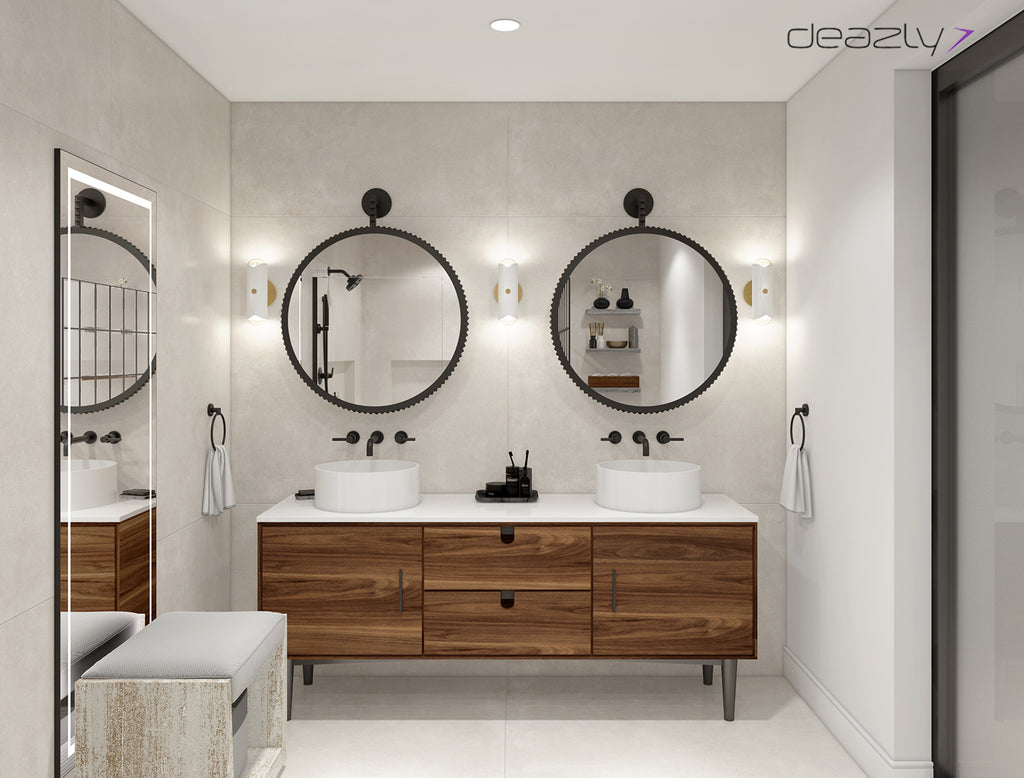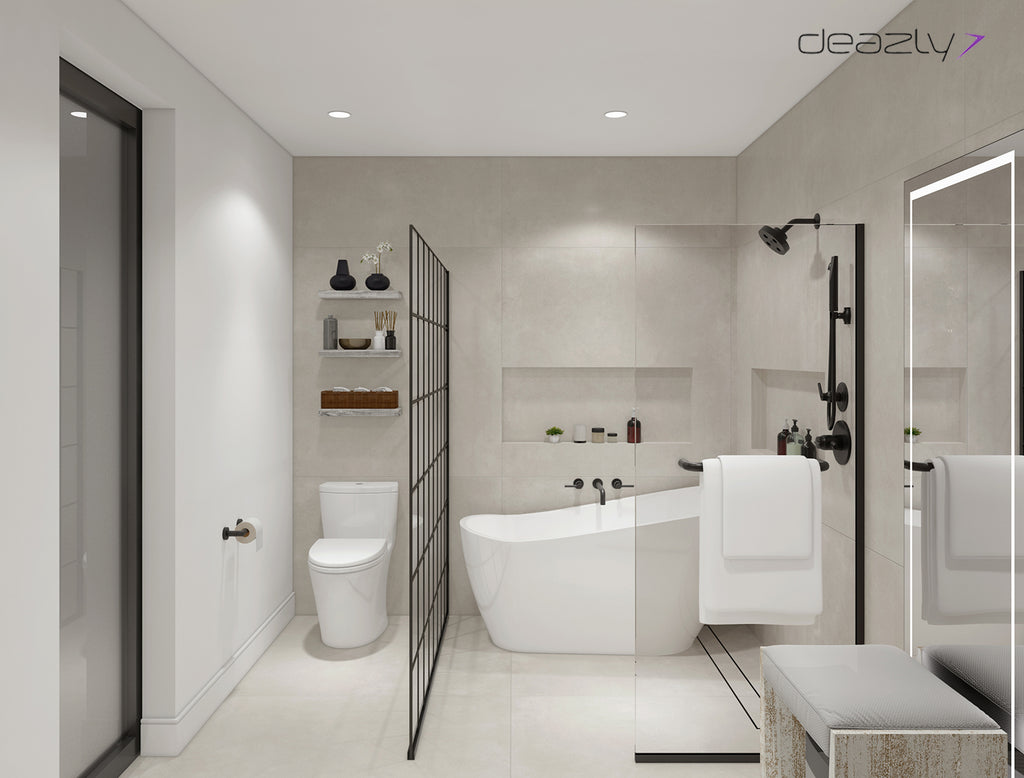 The vanity wall is the main focal point. The carved mirrors are the showstopper in this space! Materiality was selected to mimic concrete panels yet reinterpreted as large format porcelain tiles, a solid solution for a bathroom. The niches provide ample storage for body products. Black matte finishes provide a drastic contrast against the other finishes. A frosted glass partition offers privacy between the entry to the wet area. The entry door into the space has a frosted glass panel, allowing additional light to pass through.