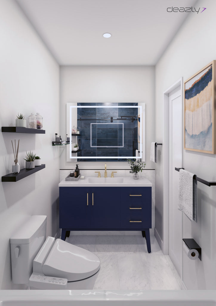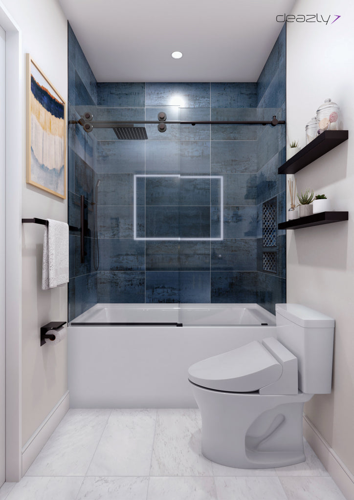 A play of contrasting colors and clean lines using deep blues, metal accents, and uncomplicated design details generate a sophisticated atmosphere. Smooth polished surface of this field tile has trendy soft white tones that exude chic el- egance and is the perfect base for the equally elegant blue vanity with plenty of space for storage. Black shelves and the niche in the shower add functionality and elegance to this cool bathroom. A mix of materials keeps the design interest- ing, while the white walls and overall modern design promotes a bright and airy feeling.