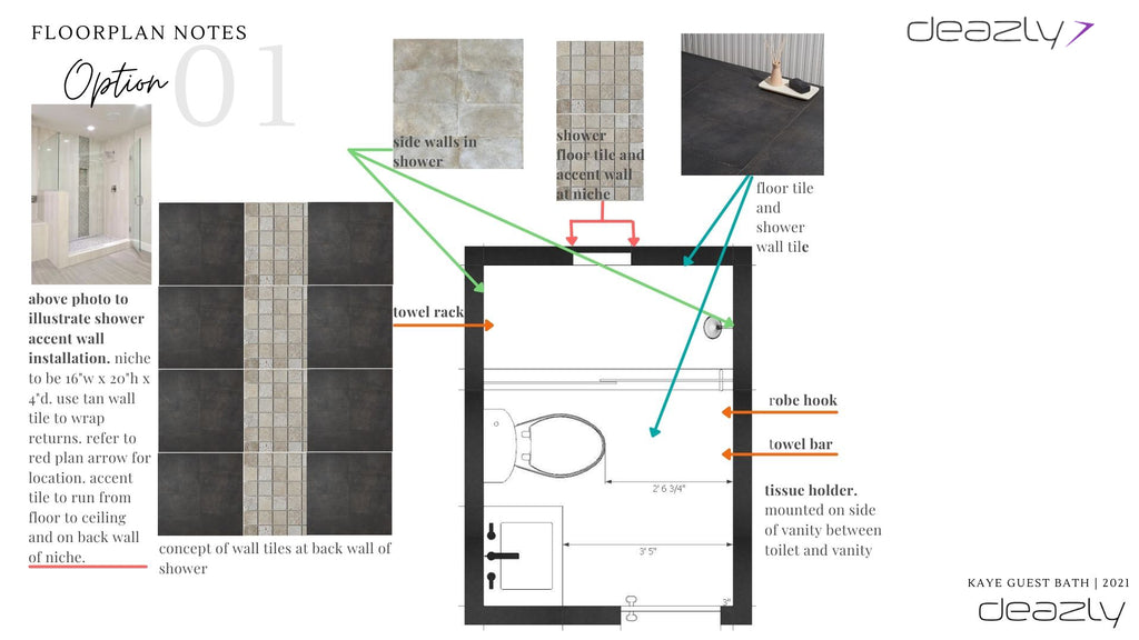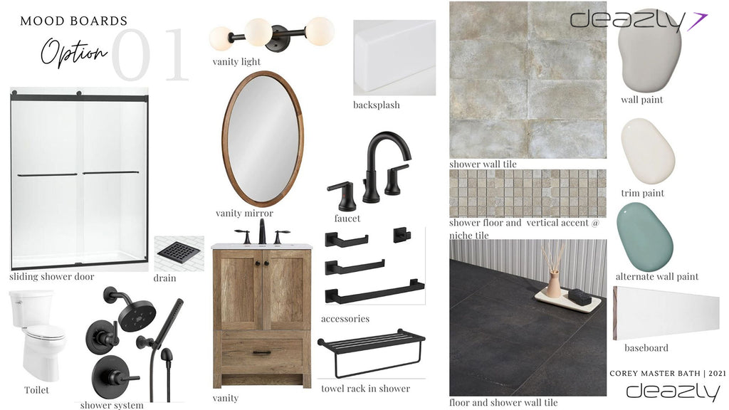 This style emphasizes the clean lines of mid century modern and the natural feel of textured stone. Black accessories and fixtures balance the depth of the dark floor tile. Shower wall tiles installed in a staked bond pattern and a feature accent of a vertical column of mosaic tiles speak to the geometric patterns that are hallmarks of the mid-century style. A natural wood vanity and mirror provide a layer of organic softness.