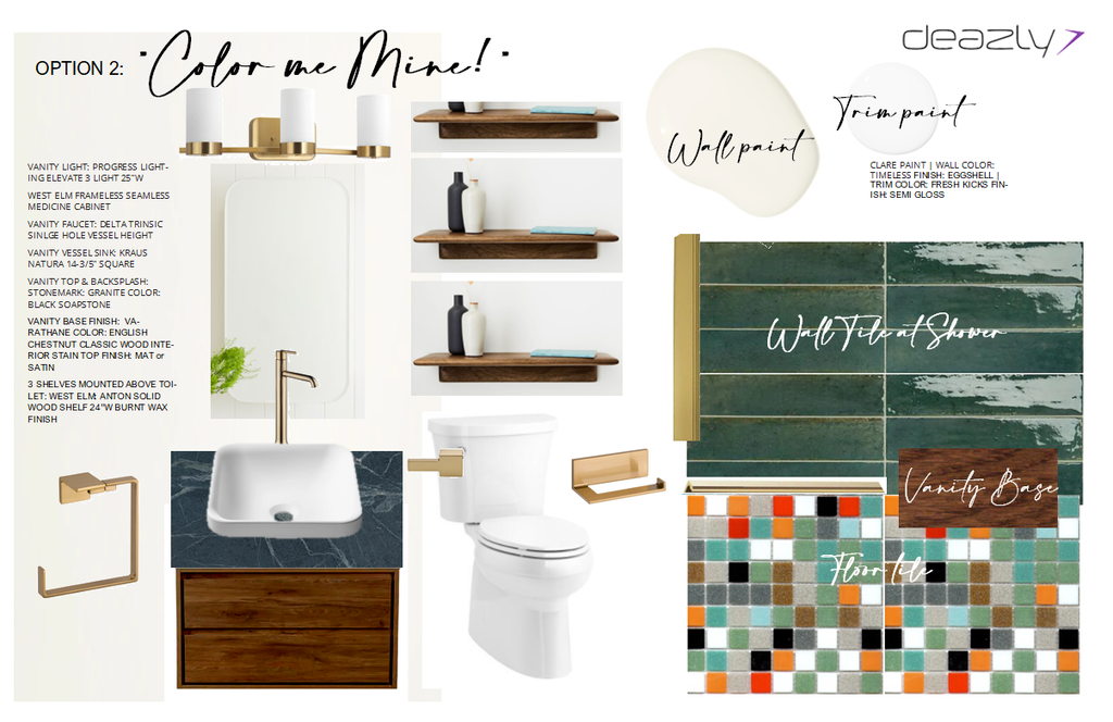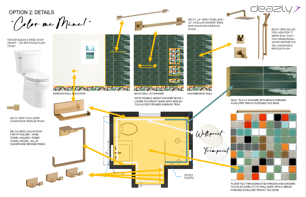 Mixing in more pops of color in the floor and adding a more handmade feel at the shower wall tile – this scheme is a little more playful and moody with the accent colors. Wood and Brass accents balance each other out and continue the warmth throughout.