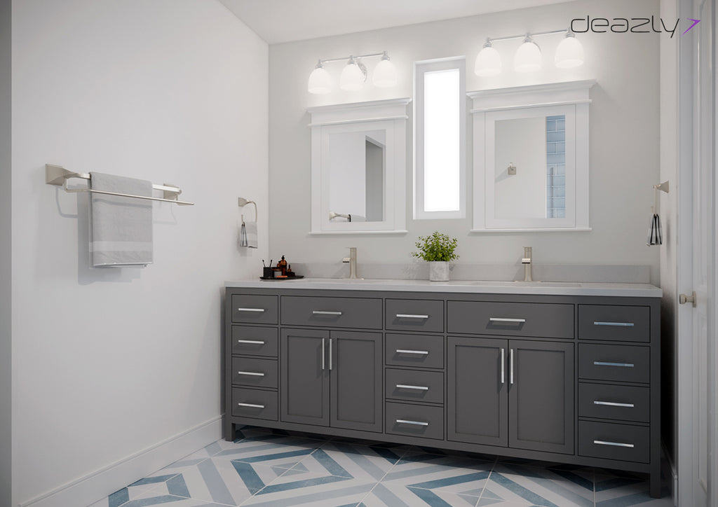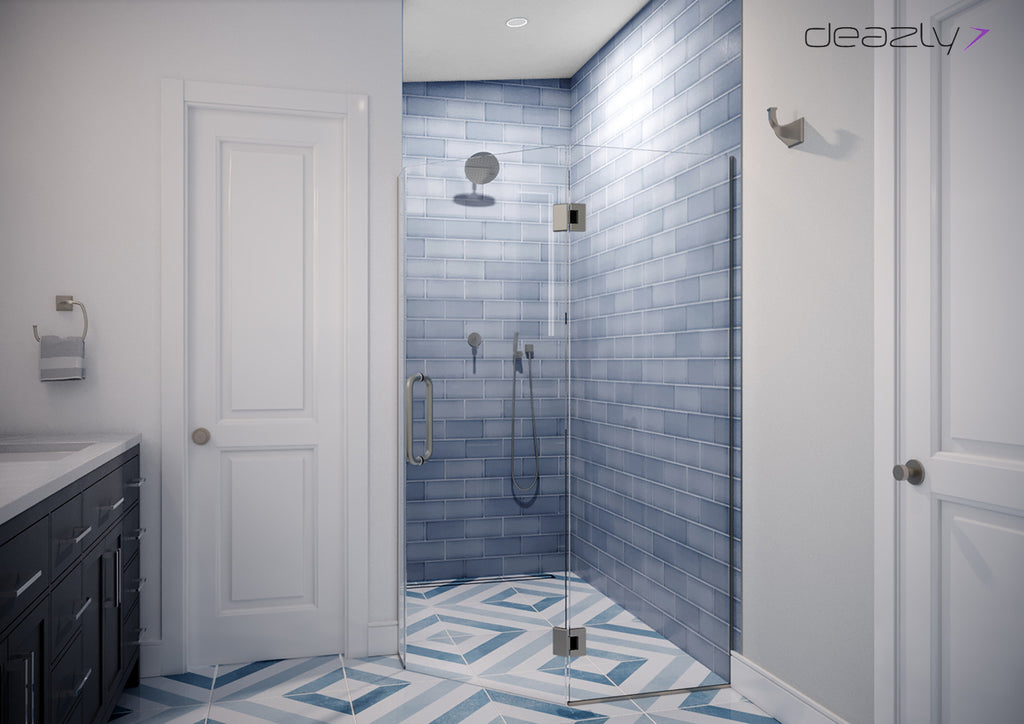 The finishes chosen for this concept are meant to provide a bright and visually relaxing space to clean up and destress. The blue patterned tile takes center stage in this design creating a fun yet soothing backdrop. The contemporary gray vanity and pretty blue/gray tile in the shower area ties into this color scheme beautifully. All this color and pattern is balanced with a use of classic white paint resulting in an open and airy bathroom ready to help you take on the day.