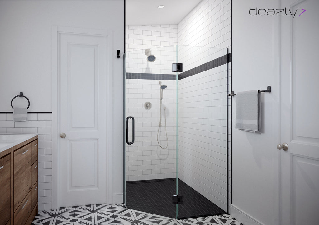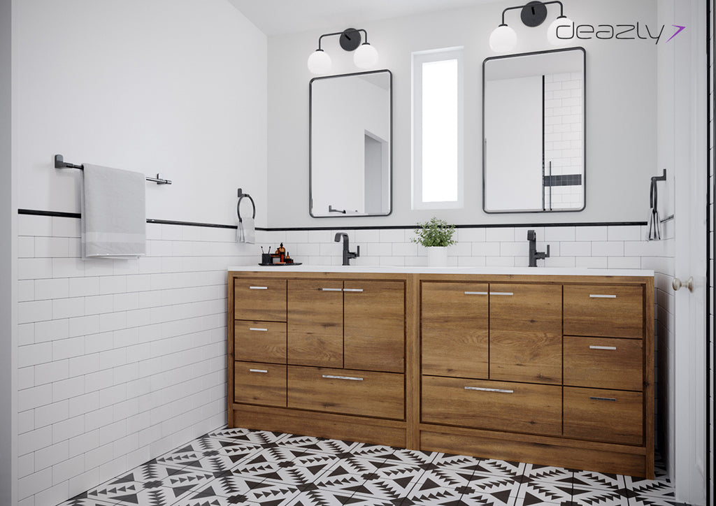 A medley of patterns, textures and neutral colors paired with warm wooden features lend this room a fun yet polished feel. While providing plenty of storage, the wood vanity boasts plenty of texture in the natural grains adding a dynamic visual element to the space. The black tile trim and matte black geometric light fixtures are just enough punch to bring about a good visual structure to the room.