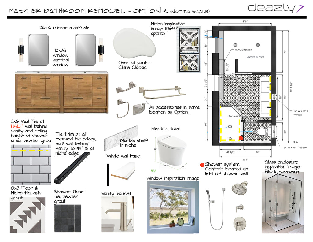 A medley of patterns, textures and neutral colors paired with warm wooden features lend this room a fun yet polished feel. While providing plenty of storage, the wood vanity boasts plenty of texture in the natural grains adding a dynamic visual element to the space. The black tile trim and matte black geometric light fixtures are just enough punch to bring about a good visual structure to the room.