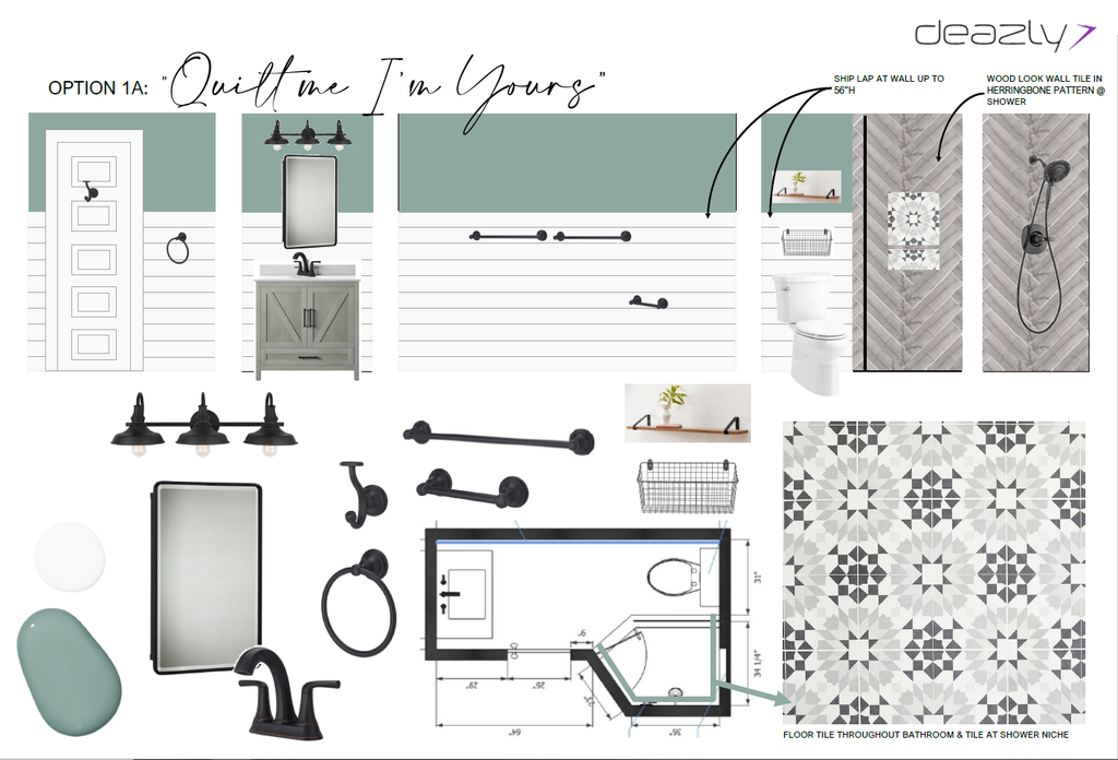 The grey patchwork patterned floor tile draws your eye in and around the room. The white ship lap walls offer texture and brighten the room for a clean look. Paint above the ship lap offers color while the aged bronze hardware offers a nice contrast to the bright room.