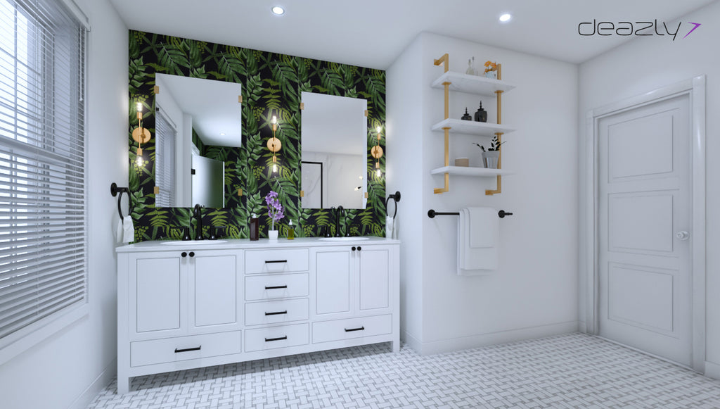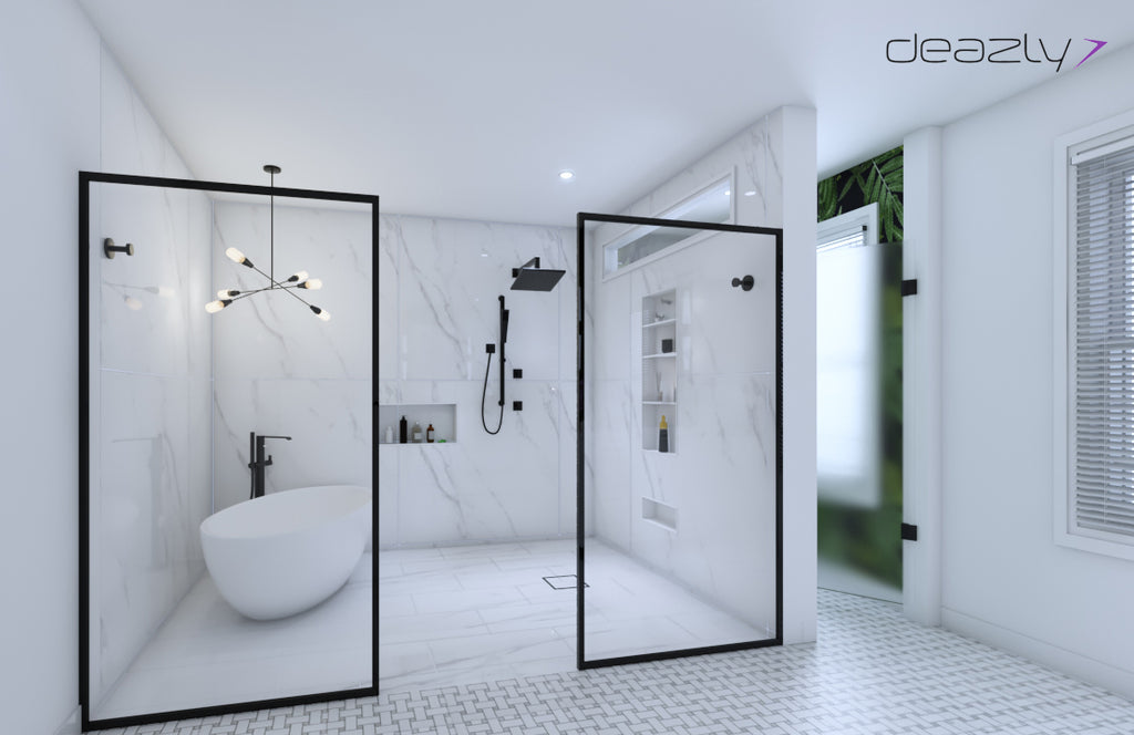 This design features a clean, luxurious and open space illuminated by ample natural light. The bold, black metals contrast the crisp white in the wet room, while the greenery of the wall vinyl invites warmth and beauty.
