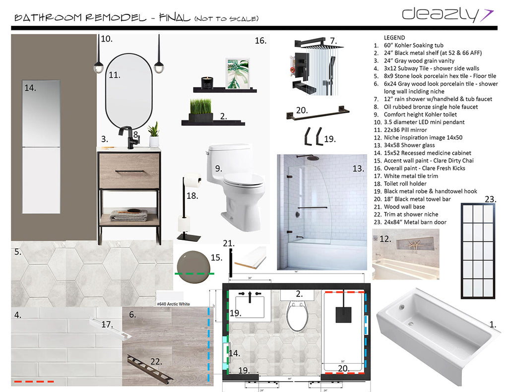 Earthy and textural, this scheme invites the user to a soothing space where you can relax and rejuvenate. The light palette is accented with bold pops of oil rubbed bronze and black hardware. Modern & clean lined metal shelves offer opportunities to personalize and decorate the space to the users taste. Plenty of storage is provided within the vanity and recessed full length medicine cabinet to hold toiletries, minimizing clutter. The cool raindrop pendant and the pill shaped mirror complement the rest of the hardware with a bold touch of style.