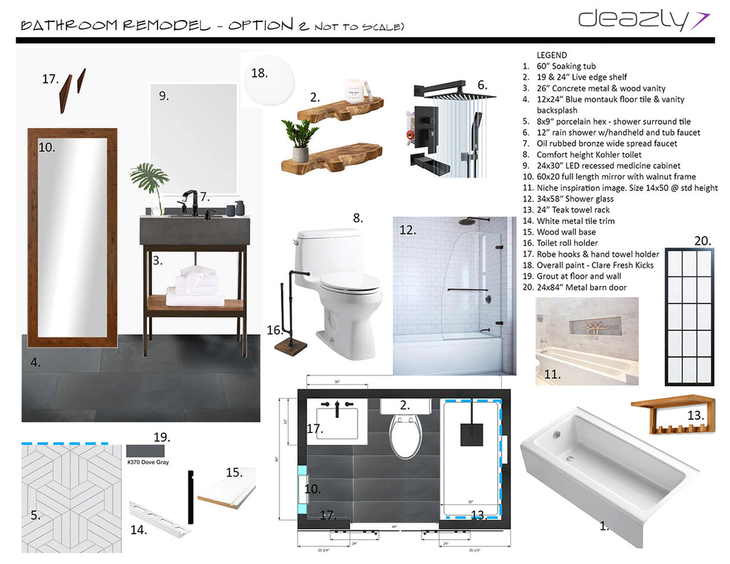 This option has light and natural finishes throughout and is grounded with a beautiful blue-gray slate-like tile. These finishes are meant to offer a visually relaxing space to clean up and destress. It’s minimal and fresh with a nod to nature seen in the generous use of wood accents throughout. The shower area is wrapped in a fun hex-patterned tile that adds a dynamic visual element to the rest of the space. The shower niche, recessed medicine cabinet mirror and vanity shelf all offer ample storage for the user.