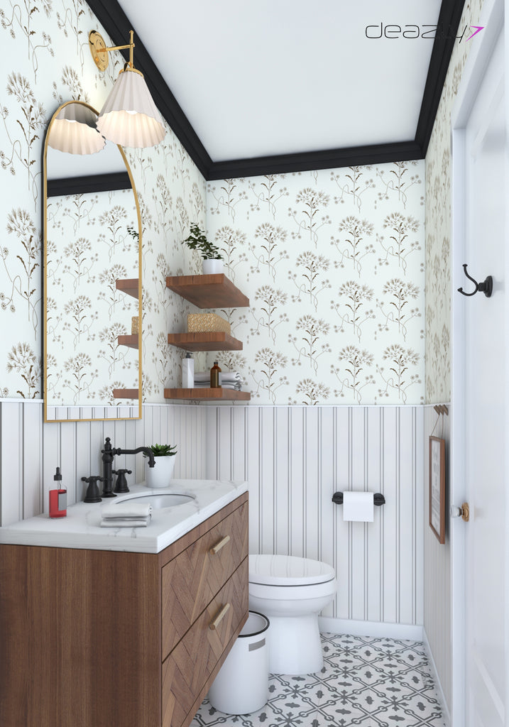 While the space is modern in design, traditional elements are introduced through the pleated shade on vanity light, and detailed profiles of the plumbing fixtures and bath accessories. This black & white space has a few accents in brushed brass and is nicely balanced with natural wood tones seen at the vanity & reclaimed pine shelves. The highly patterned flooring grounds the space, while the botanical wallcovering eludes to the farmhouse chic images this space was inspired by.