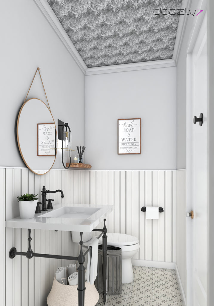 The showstopper of this space is the vanity sink with a dainty, black matte frame and a farmhouse inspired Faucet. All other fixtures are simple with modern profiles. The use of wood at the vanity mirror & live edge Shelf introduces natural elements and provides warmth within the space. Without the graphic wallcovering On the ceiling the space reads overall as neutral, however this highly patterned design creates interest and Offers a unexpected surprise.