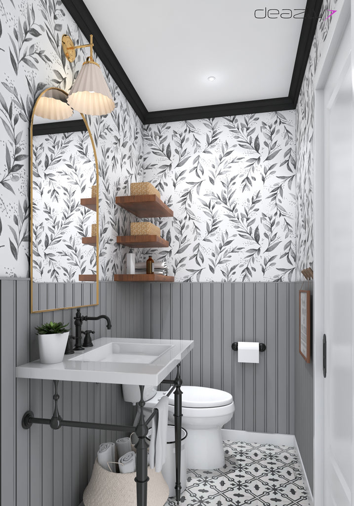 While the space is modern in design, traditional elements are introduced through the pleated shade on Vanity light, and detailed profiles of the plumbing fixtures and bath accessories. The black, grey & white Space is nicely balanced brushed brass accents and natural wood tones. The highly patterned flooring Grounds the space, while the botanical wallcovering eludes to the farmhouse chic images this space was Inspired by.