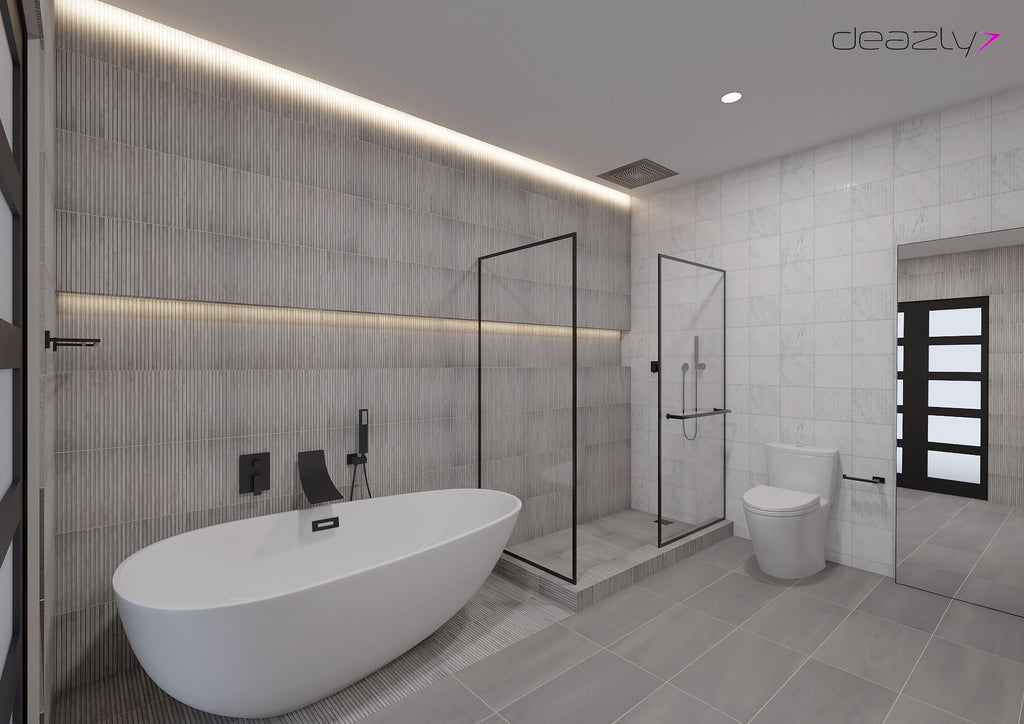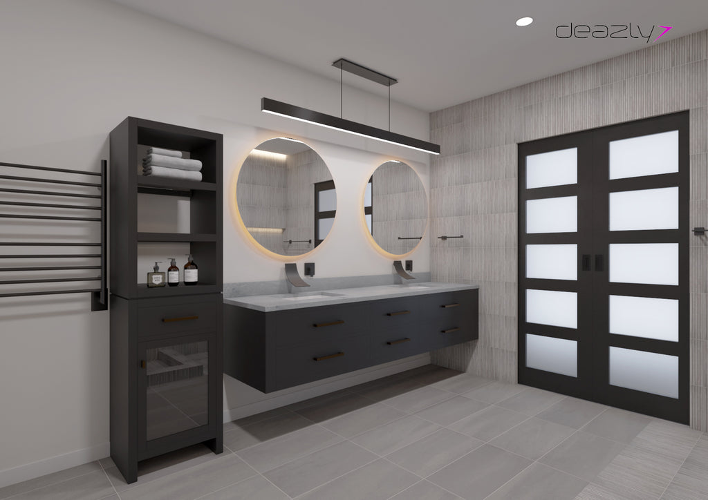 Balance is achieved by pairing bold and dark elements against light and fluid ones. The dark vanity and linen hutch soften against the 3D slat wood-look wall tile, applied in a waterfall configuration from wall to floor. Every fixture is a feature. Each element a conversation piece. From the swoop of the faucets to the pendant bar lighting, this room commands attention and asks to be lingered in.
