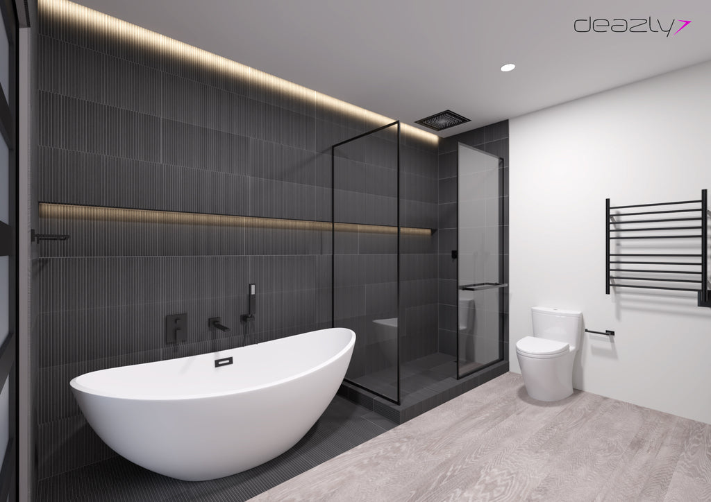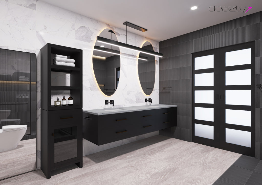 Deeper, moodier graphite slat 3D tile in a waterfall configuration, provides a stunning backdrop for the oval shaped tub - the movement in the tile pattern, all highlighted by the cove lighting on the wall and backlit room length niche. The oversized oval backlit mirrors are unexpected and another statement element against a vanity wall clad in large format Calacatta marble tile. This is so much more than a bathroom, its a sanctuary.
