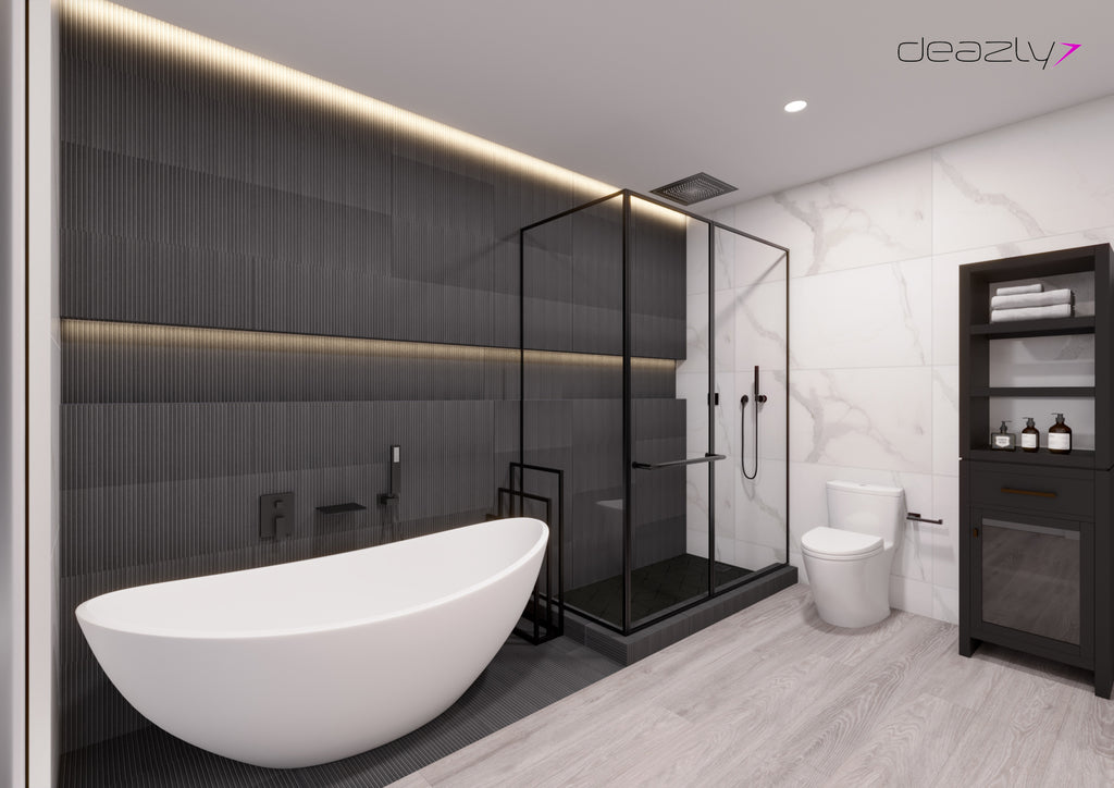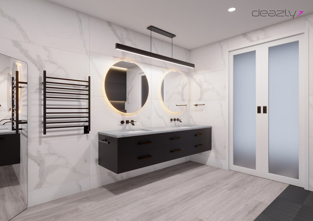 Balance is achieved by pairing bold and dark elements against light and fluid ones. The dark vanity and linen hutch soften against the 3D slat wood-look wall tile, applied in a waterfall configuration from wall to floor. Every fixture is a feature. Each element a conversation piece. From the swoop of the faucets to the pendant bar lighting, this room commands attention and asks to be lingered in.