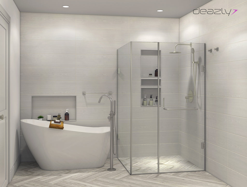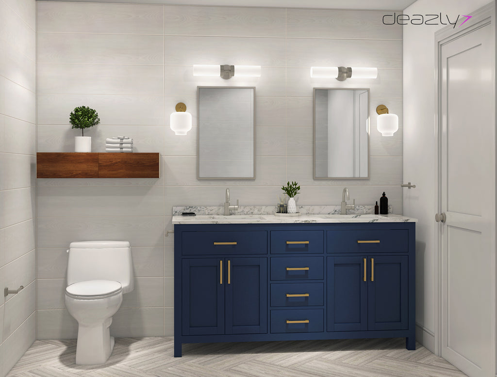 Complementary duality was the goal here. The bright blue vanity is given the spotlight against calmer whites, grays, and beiges in the tiling. Visual and tactile textures feature prominently in the wood-look tile flooring and shiplap look wall tile in porcelain making everything functionally water-tight without sacrificing elegance. Moments of mixed metals in the plumbing, lighting, and accessories of brushed nickel, brass, and g