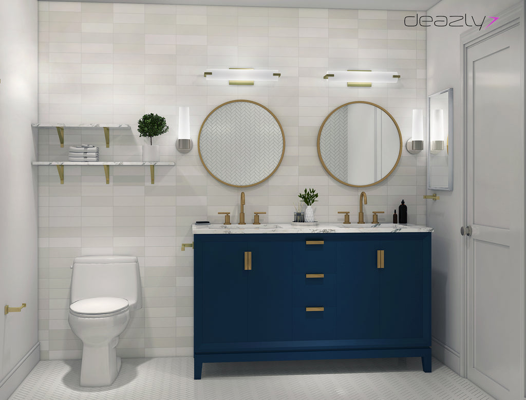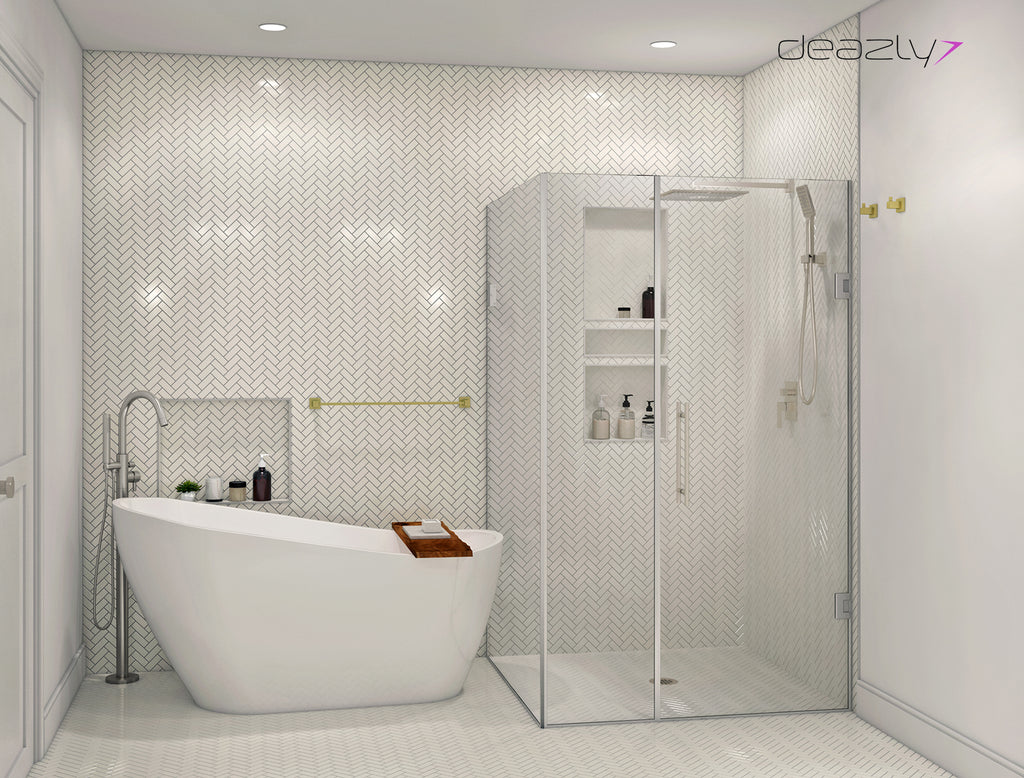 Balancing seeming opposites drove this design. Where the vanity grounds the space with sharper lines, the fixtures, tile, plumbing, lighting, hardware, offer movement, softness, and lightness. The vanity tile has wonderful depth and texture, providing interest and allure. The continuity of the herringbone tiled wet wall and floor tile allow the room to seem more expansive than it is. The white, light grays and brushed nickel plumbing, lighting, and hits of burnished brass hardware bring in the elevated glamour every space needs.
