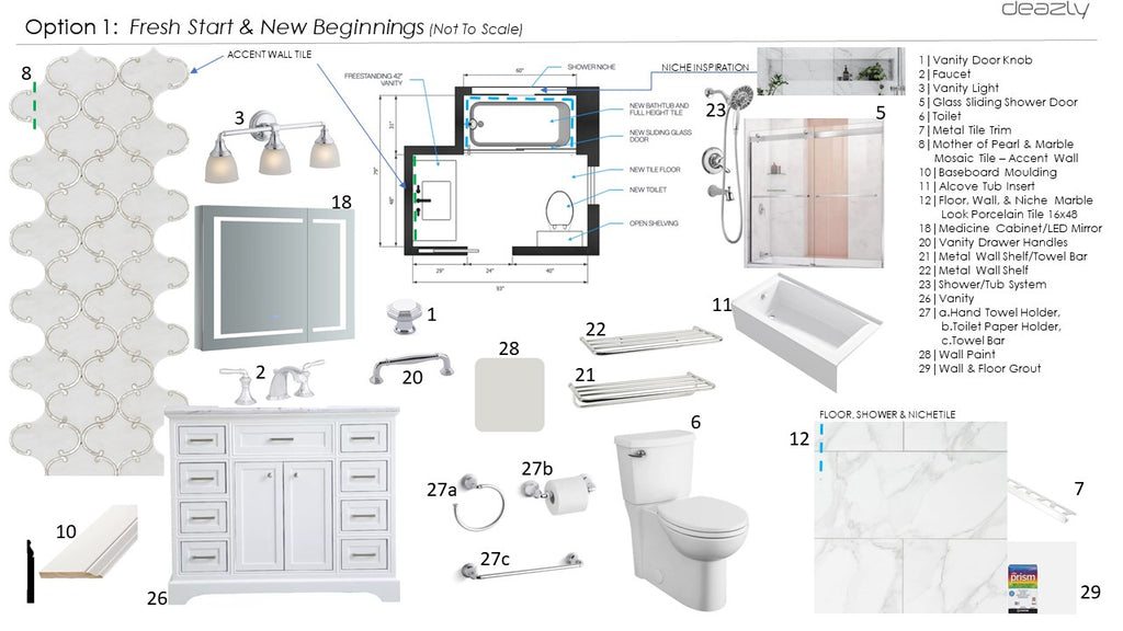 This light and fresh scheme invites the user to a bright and clean space in which to unwind, refresh, and reset. The white and hints of neutral gray palette is paired with polished chrome hardware for a timeless and airy design. The chrome shelves offer a place for hanging and neatly displaying towels. Plenty of storage is provided within the vanity and recessed medicine cabinet. The triple light wall sconce and the LED front-lit medicine cabinet mirror illuminate the space well. The accent wall behind the vanity features a mother of pearl and marble mosaic wall tile in a curvy Paseo tile pattern adding a playful yet elegant element. The vanity features a marble top which adds to the clean and classic design. The rectangular 'marble look' of the porcelain tiles on the floor are echoed in the surrounding shower walls and go up to the ceiling for a harmonious and timeless space. The long horizontal tiled niche is visible through the glass shower sliding doors adding storage for shower accessories and creating visual depth.