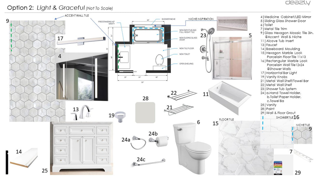This option offers whites and subtle hints of gray for a classic, yet sophisticated look. The hexagon shaped floor tiles, glass accent wall tiles, and chrome vanity knobs bring interest and cohesion for an edgy design. The light and neutral color palette combined with the visually textured materials give depth an ethereal feel to the space.