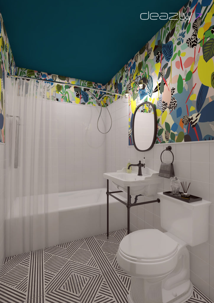 This eclectic and sleek design is inspired by pop art. The wallpaper with its bold colors is a beautiful surprise in the room. Breaking from traditional patterns, the stripes in the tiles are overlapping, and go in opposing directions to form a multi-dimensional look. The black and white floor pattern along with the colorful graphic foliage of the wallpaper is perfect for adding fun to your interiors.