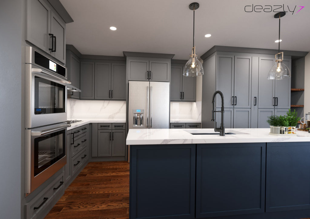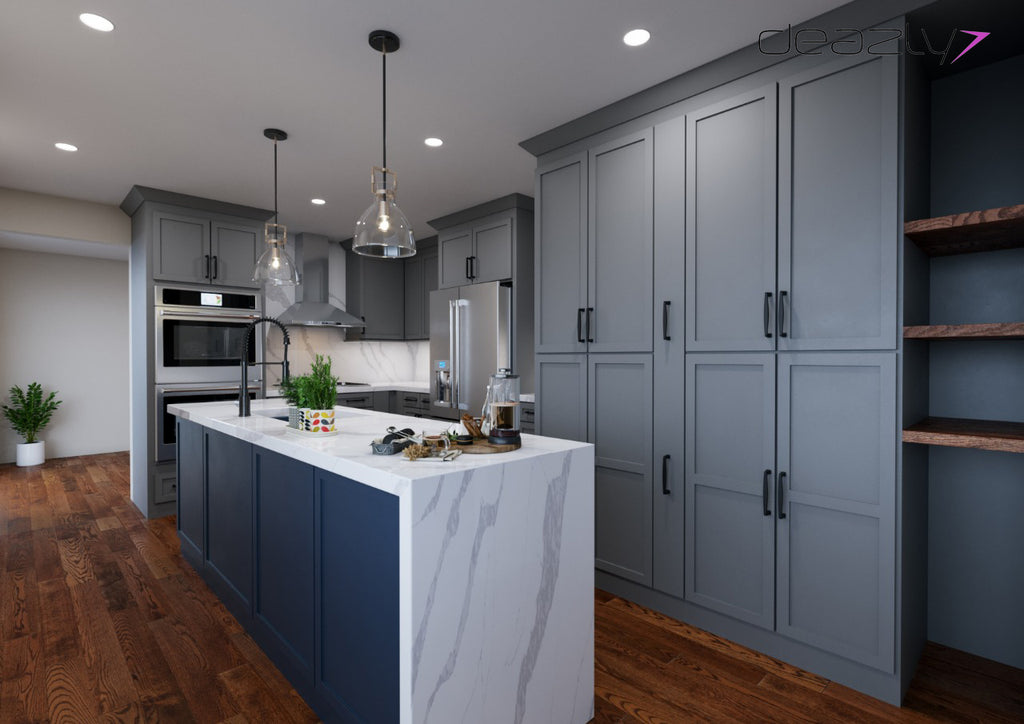 Inspiring anyone to cook, this modern redesign features an industrial/ farmhouse style kitchen with grey perimeter cabinets and a blue island that is balanced out with the warm wood floor and accent shelves. The waterfall detail on the island counter with the industrial lighting above provides a gorgeous focal point and a lot of opportunities to gather around with friends.