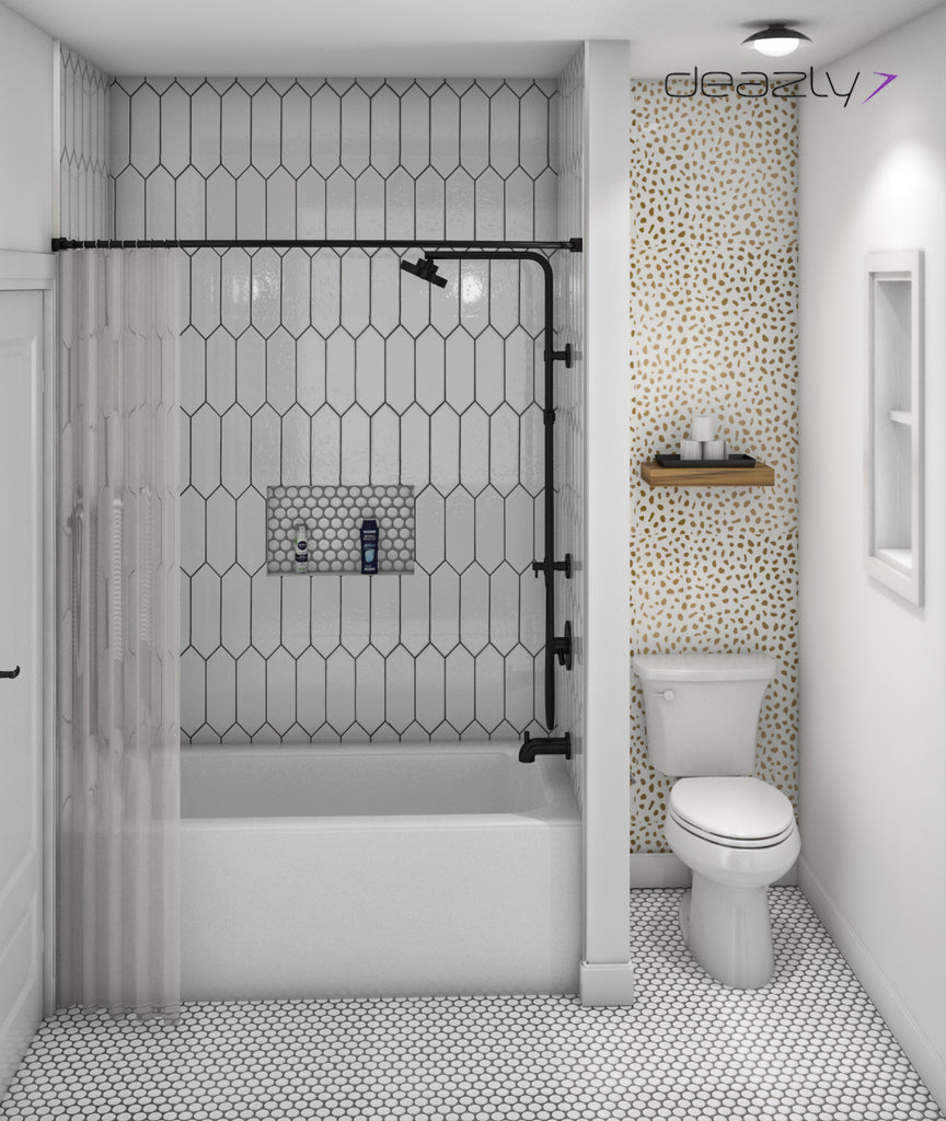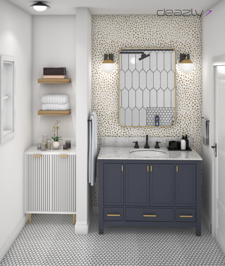 Mixed metal finishes, statement lighting, and decorative wallpaper add personality and glamour to this concept. The neutral wall color palette showcases the bold geometric tile patterns in this contemporary interpretation of the traditional farmhouse look.