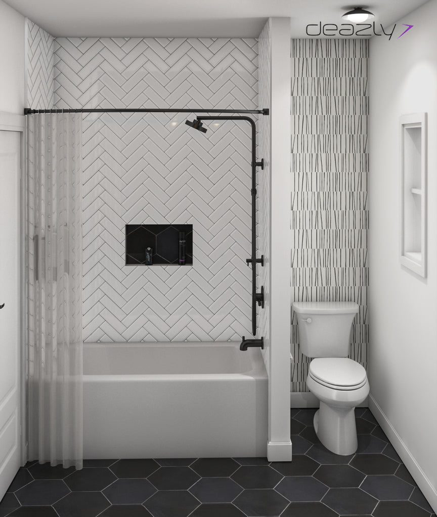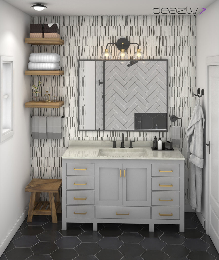 IN THIS CONCEPT, ACCENT LIGHTS AND THE VANITY TAKE THE CENTERSTAGE, IN CONTRAST WITH MINIMALIST FURNISHINGS AND A CRISP YET NEUTRAL COLOR SCHEME. METAL ACCENTS WITH BOLD GEOMETRIC TILE PATTERN MODERNIZE THE RE-LAXED FARMHOUSE LOOK.