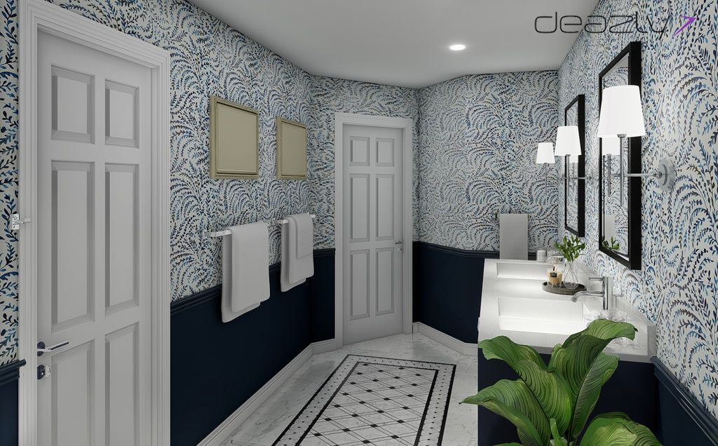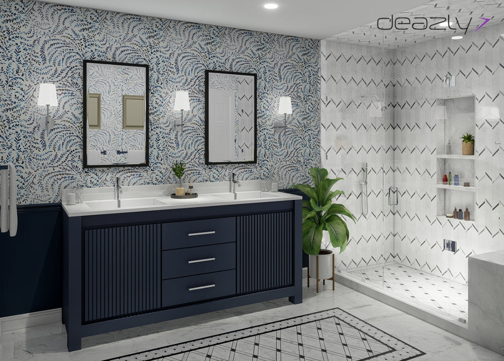 The complex pattern in the wallpaper is complemented by the dark blue wall color, while the vanity with its chrome hardware stands out against the marble floor tiles. The traditional tile border on the floor complements the modern marble mosaic tile pattern in the shower area to create a unique, multi-layered space.