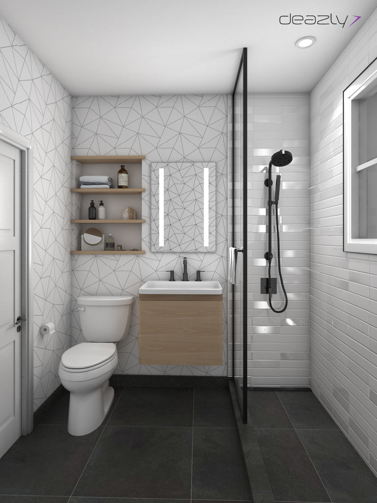 The combination of an accent wall covering with the brick shower tiles, installed in random variation of glossy and matte finish, cre-ate a sleek and minimalistic design that embraces simplicity.