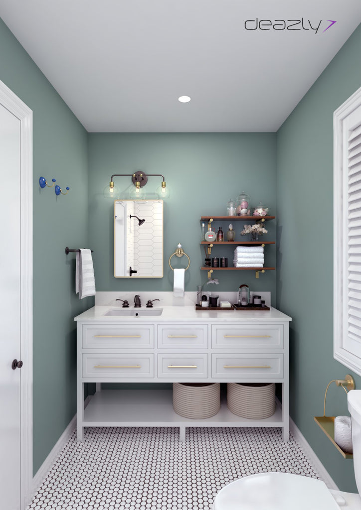 The combination of a modern vanity, vintage details and bright wall color makes this bathroom look luxurious and elegant.