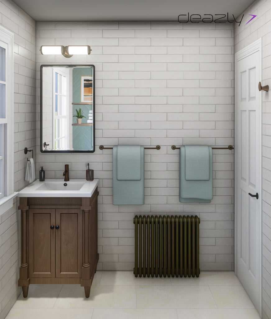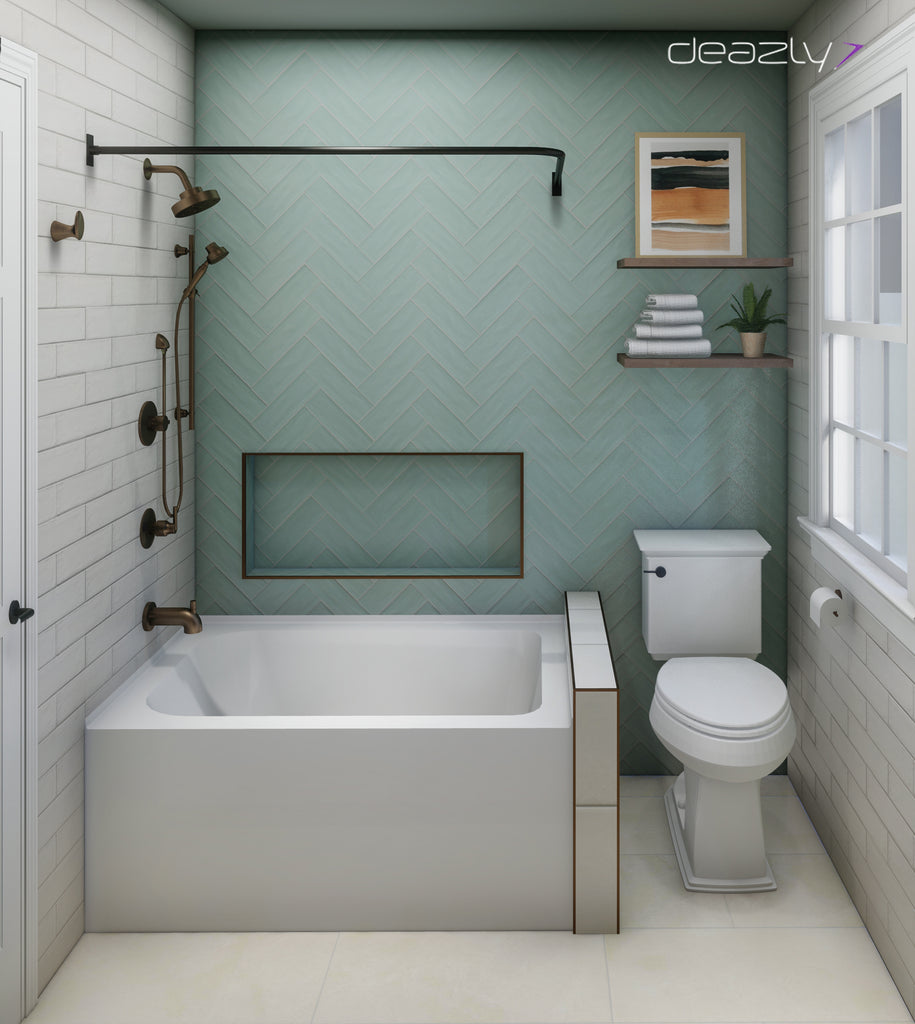 In this design concept, the white subway tiles take a backseat so the aqua green, chevron accent tiles can take the center stage. The handmade design of the tile offers textural intrigue. Look closely and you’ll notice the grooves.
