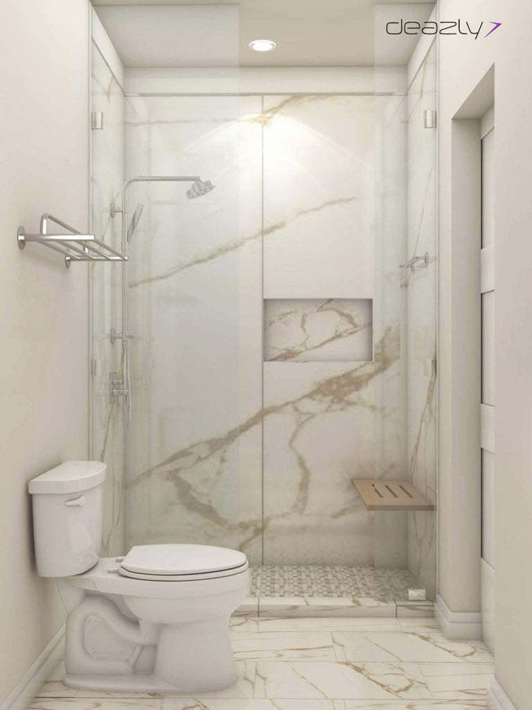 The large-format Calacatta Oro porcelain tiles 48” x 102” with its thin gold and gray veining is the focal point of this scheme. The large tiles make the room look bigger, streamlined and reduces the ‘busy’ factor while making the room feel modern and cozy. The Calacatta Oro applied in three different formats and finishes large format polished finish on the shower wall, a mosaic regular finish on the shower floor, and a 12” x 24” regular finish on the floor balances the overall aesthetics in this warm scheme that is classic and welcoming.