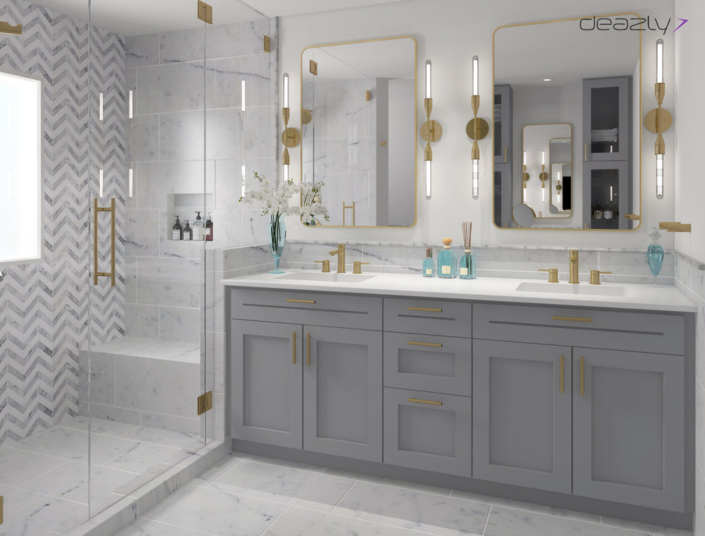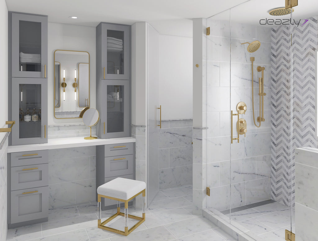 Gorgeous marble tiles combine with grey and gold tones for a perfect balance of Warmth and coolness. The herringbone pattern at the shower wall and the built In makeͳup vanity add the unexpected making this traditional design of the bathͳ Room feel luxe and fresh yet classic. This bathroom is everything glam!