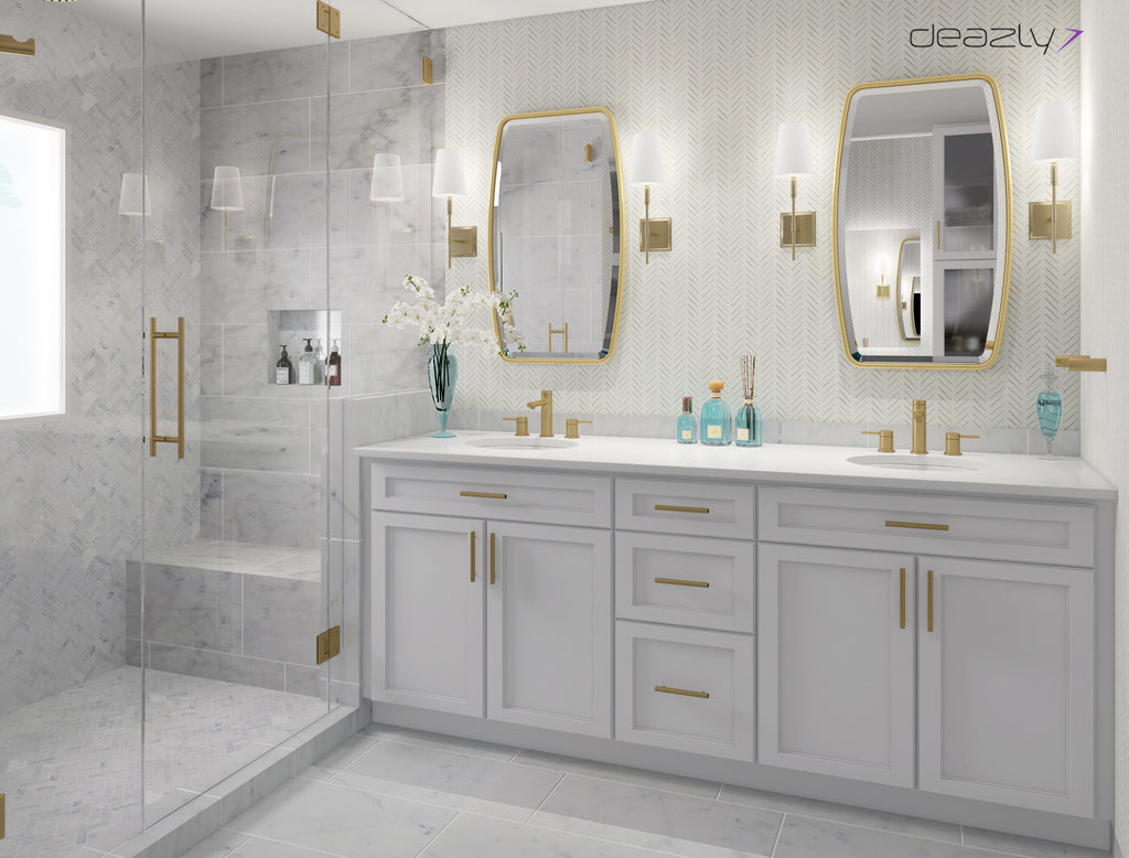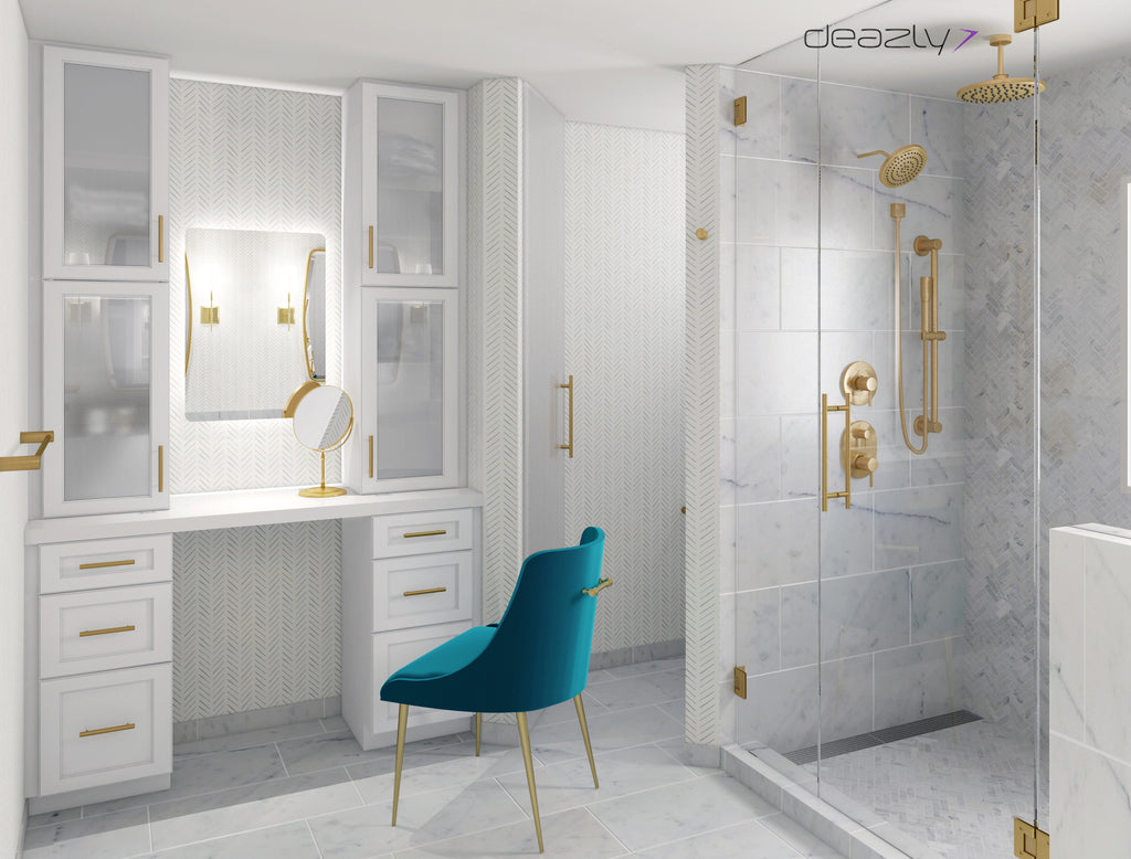 This concept is the essence of a timeless traditional bathroom. The marble chevron small-scale pattern at the shower wall, paired with marble finish floor tiles, built-in white vanity with brass accents, and the subtle herringbone wallcovering will stand the test of time with its traditional appeal and neutral palette. The makeup vanity area flanked with floor-to-ceiling storage allows you to pamper yourself with a beautiful space just to call your own. Glass in the cabinet doors adds a reflective and airy layer to the already bright white design.