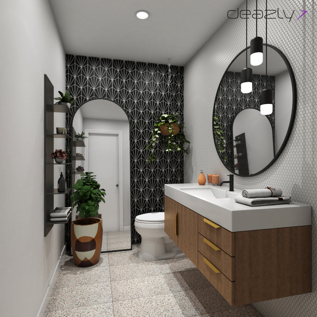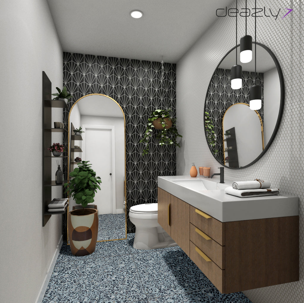 In this concept, the powder bath receives a revamp utilizing two iconic trends popular during the mid-century era terrazzo and bold patterns. The wall tile on the rear wall is a nod to the request for a modern design that offers a contrasting and bold punch. The natural wood vanity and matte black fixtures provide a balanced combination to the concrete tiles. Modern touches are introduced with the offset vanity pendants and round mirror, which is minimally framed in black metal.