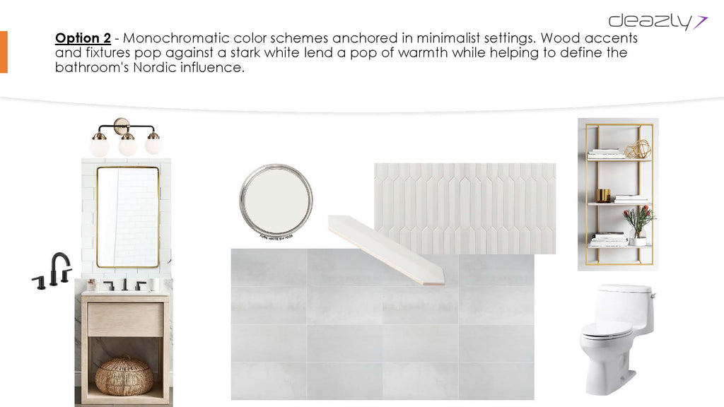 In this concept, monochromatic colors are anchored in minimalist settings. Wood accents and fixtures pop against a stark white background and lend a pop of warmth while helping to de fine the bathroom’s nordic influence.