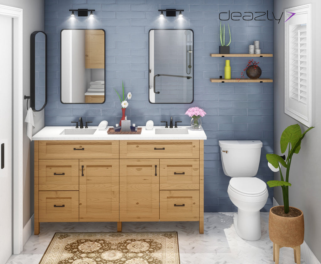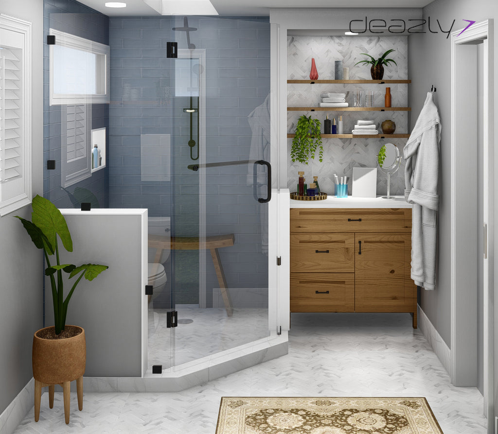 Mixtures of new and old elements balance each other in this concept. Black powder-coated hardware and vanity in wood finish are a stark contrast to the Carrara marble tiles and the blue mirror finish tiles. Carrara marble tiles in a chevron pattern on the floor add a subtle texture to the room.