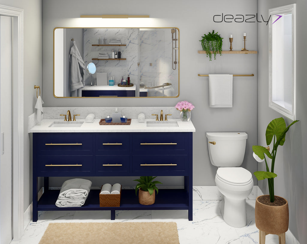 Blue painted cabinets with satin brass finished hardware & natural wood finished shelves complement each other to create an elegant bathroom decor. Neutral wall color and white tiles with texture make the room feel bigger and brighter.