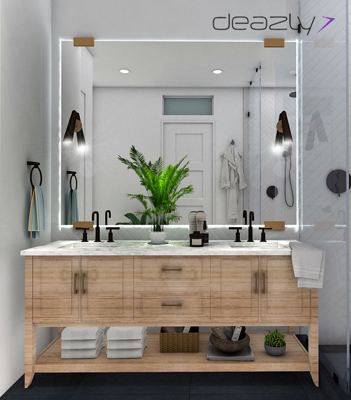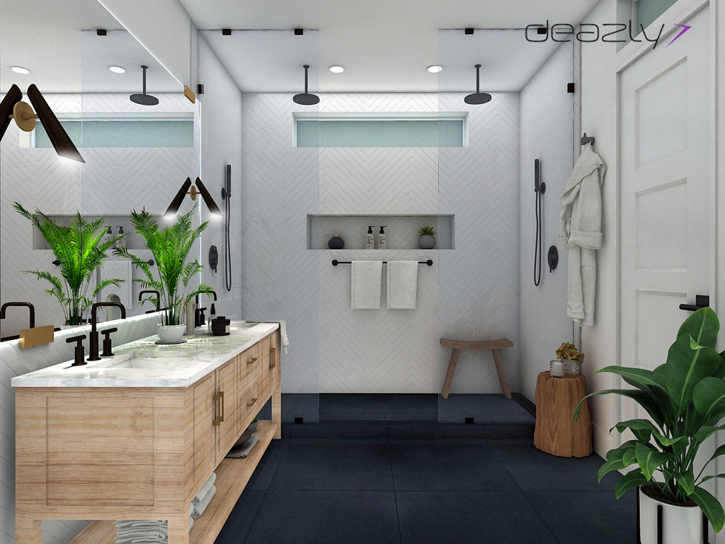 With prominent touchable texture, the 24” x 24” Graphite Porcelain floor tile adds a sense of dimensionality to the space. The dark gray color of the le compliments the classic white hue of the 2” x 20” subway tile placed in chevron pa ern to create a striking look with a heightened sense of flair.
